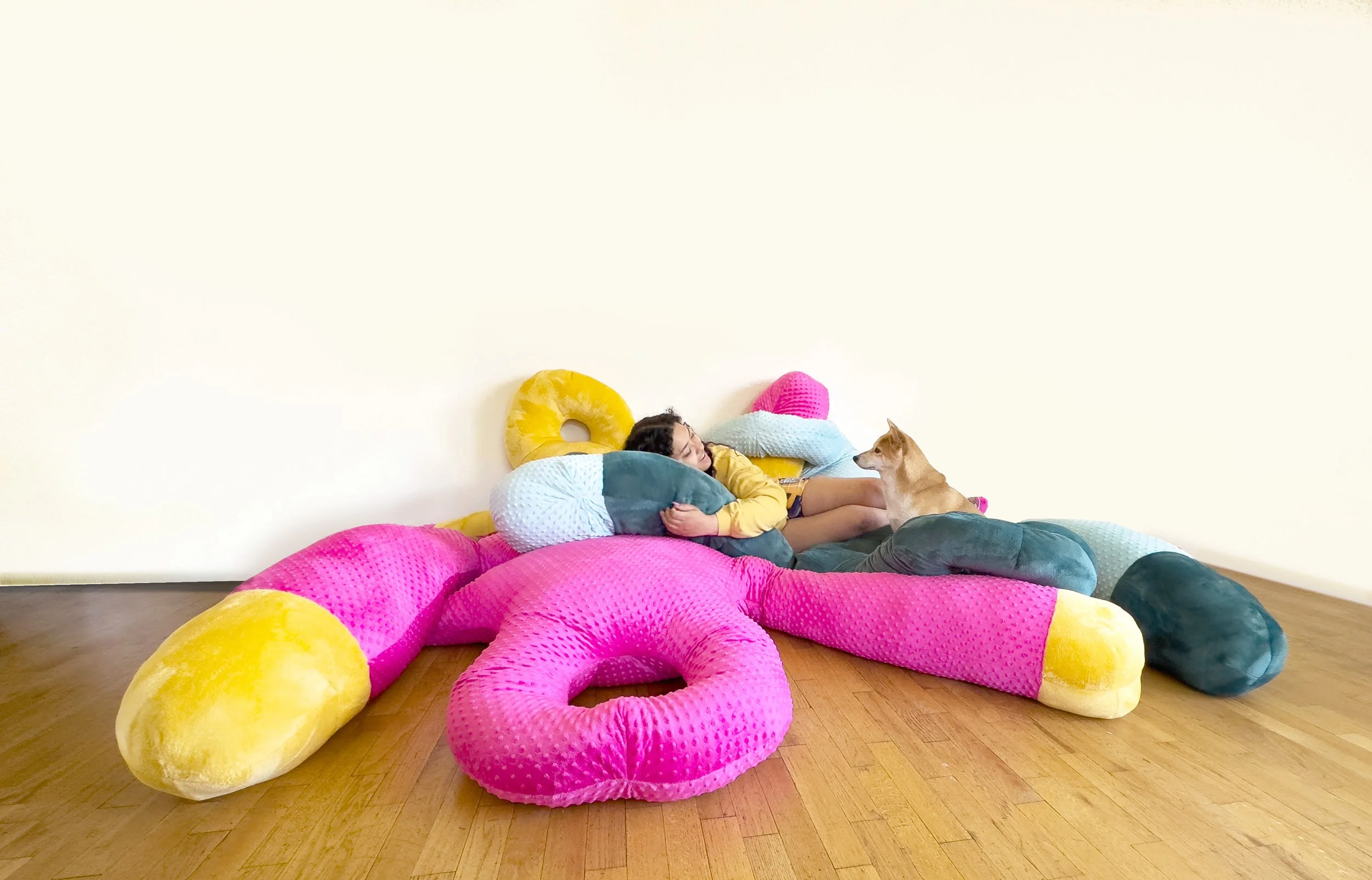 Through layered stuffing, density, and weighted construction, he creates floor-based works that examine bodily presence and tactile accumulation.